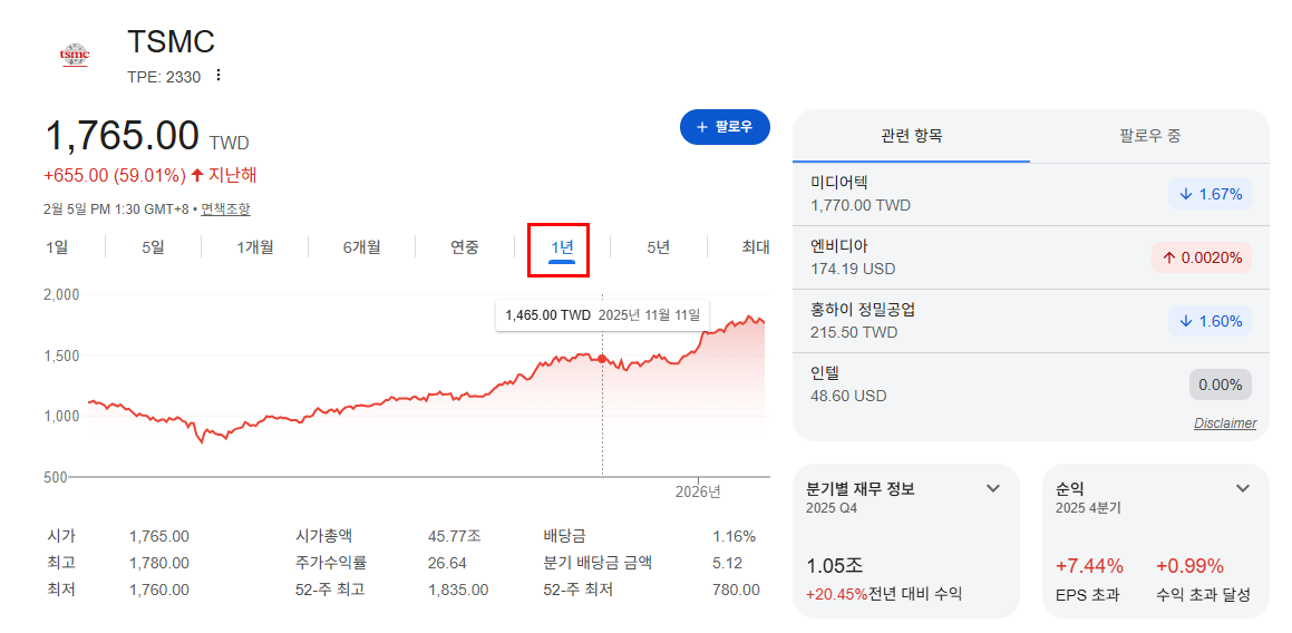 | 시가총액 | 7,000억~8,000억 달러 | 글로벌 반도체 최상위 |
