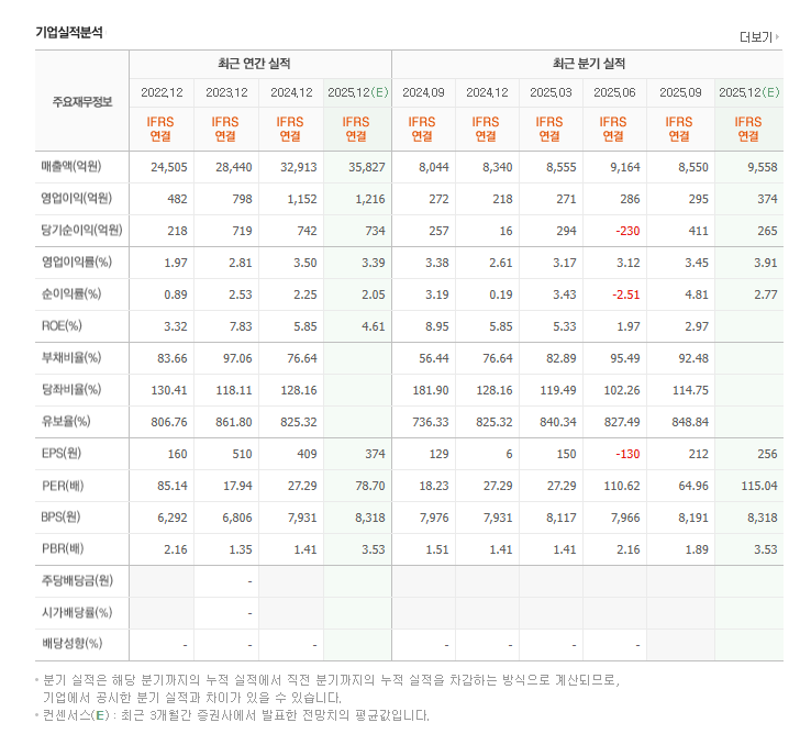 | 투자 의견 | 분기 영업이익 300억 이상 유지 + 영업이익률 4% 이상 시 중기 접근 유효 |