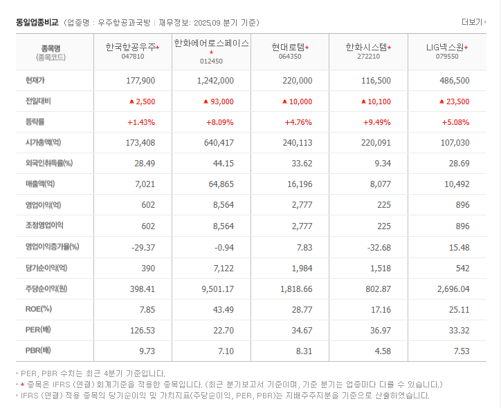 | 시가총액 | 약 7~9조원 | 방산 대형주 |